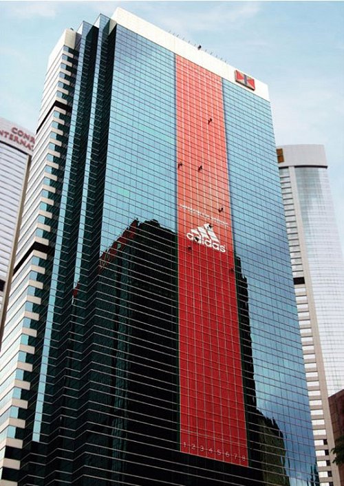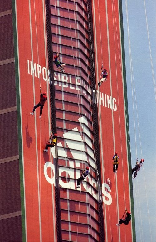 Te dwie akcje dotyczą oczywiście Adidasa. Pierwsza została przeprowadzona w 2003 (sic!) roku w Tokyo. Na ogromnym billboardzie, zamieszczonym na wysokości 12. piętra, w piłkę nożną grało dwóch kaskaderów. Akcja ta (która podobno kosztowała 180 tys. dolarów) wygenerowała publicity o łącznej wartości 150 mln dolarów. Poniżej film, który do dziś robi na mnie ogromne wrażenie.