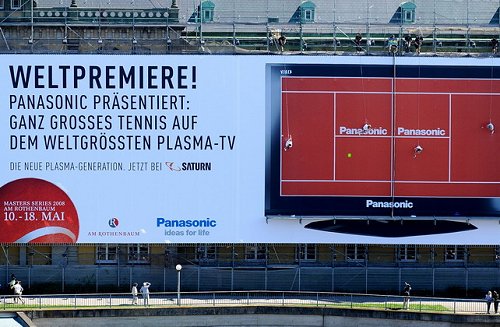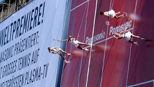 Na początku maja Panasonic zrealizował w Niemczech nietypową reklamę. Na ścianie budynku w ścisłym centrum Hamburga zamieścił siatkę o powierzchni 560m2. Na niej zaś „zawisły” cztery tenisistki, które – w pozycji prostopadłej do tejże ściany – rozgrywały mecz na żywo (film i zdjęcia poniżej). Akcja miała zakomunikować słynny turniej tenisowy Rothenbaum oraz doskonały czas reakcji telewizorów plazmowych Panasonic (zwłaszcza w przypadku szybko poruszających się na ekranie obiektów – takich jak piłki tenisowe :)). Event Panasonica – choć oczywiście nietypowy i robiący wrażenie – przypomniał mi jednak o dwóch innych, bardziej spektakularnych akcjach, od których tak naprawdę wszystko się zaczęło.
