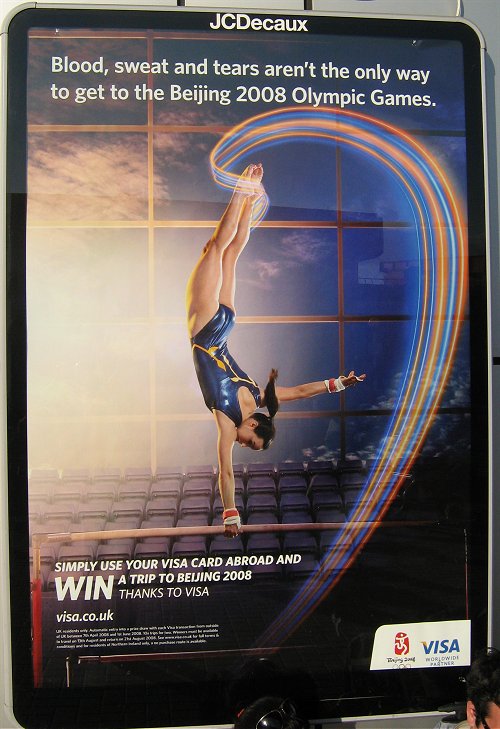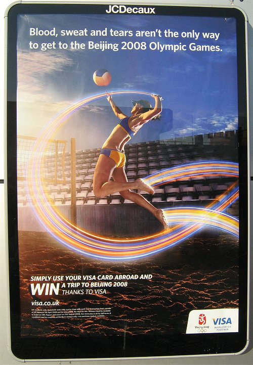 Layout nie jest może „zabójczy”, ale to pierwsza reklama, którą udało mi się zobaczyć, przygotowana przez sponsora letnich igrzysk w Pekinie. Do tej pory nie widziałam ani nie słyszałam, żeby inni producenci/ usługodawcy chwalili się faktem, że są sponsorami olimpiady. Niestety, są w dość niekomfortowej sytuacji. Czy Visa jakoś z tego wybrnęła? Trudno powiedzieć. Z pewnością nie odcina się jednak od problemu. Hasło „Blood, sweat and tears aren’t the only way to get to Beijing 2008 Olympic Games.” z pewnością jest dwuznaczne. Można je bowiem czytać jako nawiązanie do tego, co dzieje się w Tybecie, ale równie dobrze – jako nawiązanie do ciężkiej pracy sportowców przygotowujących się do najważniejszych zawodów w ich życiu.