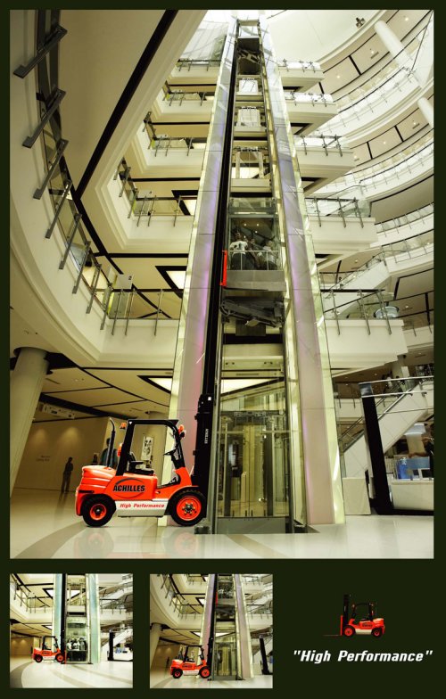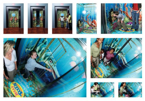 Ciekawe wykorzystanie całego dźwigu windy. Moim zdaniem, do zastosowania jednak tylko w przypadku wind panoramicznych.