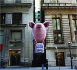 Wyobraźcie sobie, że idziecie najbardziej zatłoczoną ulicą swojego miasta i – nagle – spomiędzy budynków wyziera (nie, nie – nie wyskakuje, bynajmniej) gigantyczna, różowa, dmuchana świnia. Pierwsze skojarzenie? Akcja obrońców praw zwierząt (przynajmniej takie było moje). A-ha! Wcale nie. Otóż różowa, dmuchana świnka to nic innego, jak akcja reklamowa… nitki do czyszczenia zębów… Sytuacja, o której piszę, nie jest sytuacją hipotetyczną. Zdarzyła się w Nowym Jorku. Nie wiem kiedy i nie wiem po co, bo trafiłam tylko na zdjęcie, bez żadnego opisu. Domyślam się jedynie, że wciśnięta między budynki dmuchana świnia ma symbolizować resztki wieprzowiny, które zostają po jedzeniu między zębami (grossss…).