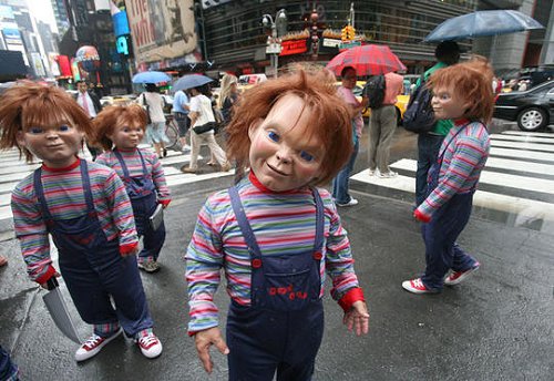 Uch. Jak ja nie cierpię horrorów. Całe więc szczęście, że nie mieszkam w Nowym Jorku. Dlaczego? Bo w zeszłym tygodniu Times Square został zaatakowany przez Chucky’ego (pamiętacie? tego z horroru Laleczka Chucky?). Gdyby tego było mało, Chucky wystąpił w sześciu osobach jednocześnie. I gonił z tasakiem przypadkowych przechodniów… W taki oto „przemiły” sposób 20th Century Fox promował 20-rocznicowe wydanie na DVD filmu Child’s Play (pol. tytuł Laleczka Chucky). Nagranie przedstawiające to, co działo się na Times Square – poniżej. I choć premiera Chucky’ego miała miejsce dokładnie 20 lat temu, jego legenda – jak widać po reakcjach przechodniów – wciąż jest żywa (ja sama, gdybym spotkała taką „laleczkę”, wiałabym ile sił w nogach… :)).