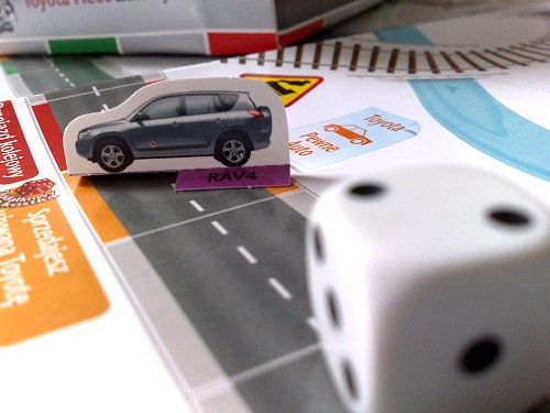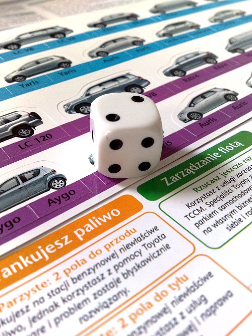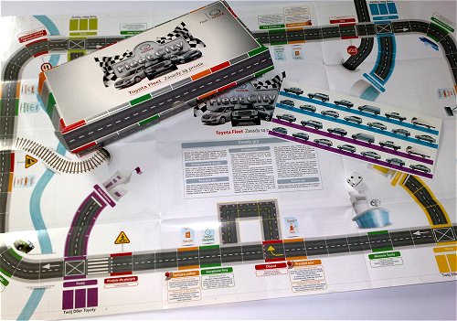- planszy, w rzeczywistości przedstawiającej dokładnie ofertę Toyoty (np. pole „Toyota Pewne Auto” to dodatkowy rzut kostką, jeśli wyrzucisz liczbę parzystą, to: „Korzystasz z programu Toyota Pewne Auto, wszystkimi formalnościami zajmują się specjaliści, a Ty możesz pojechać na wakacje.” i w związku z tym przesuwasz się o 3 pola do przodu; jeśli wyrzucisz liczbę nieparzystą, to: „Nie korzystasz z programu Toyota Pewne Auto, tracisz dużo czasu, bo wszystkim musisz zająć się sam”, w związku z tym przesuwasz się o 3 pola do tyłu); rewers planszy zawiera szczegółowy opis programu Toyota CorpoCars Management, oferty kredytowej i leasingowej Toyoty oraz informacje dotyczące obsługi serwisowej, modeli Toyoty etc.