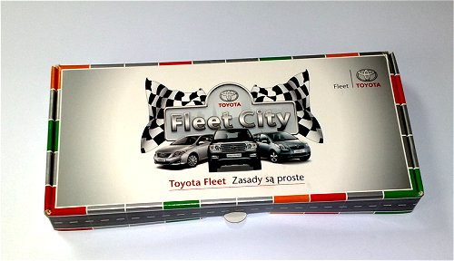 Przesyłka okazała się być… grą planszową z kategorii „ściganek” (bardzo prosta gra, dla dzieci od 3 r. ż., polegająca na jak najszybszym dotarciu wszystkimi pionkami do mety). Gra „Toyota Fleet” składa się z: