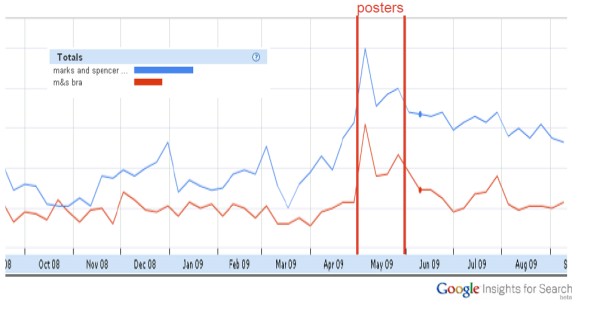 Podobne wskaźniki pokazała zresztą w swojej prezentacji Annie Rickard. Poniżej statystyki wyszukiwań haseł „marks & spencer” oraz „marks & spencer bra”. Wyraźnie widać, że w trakcie kampanii staników M&S liczba wyszukiwań istotnie się zwiększyła.