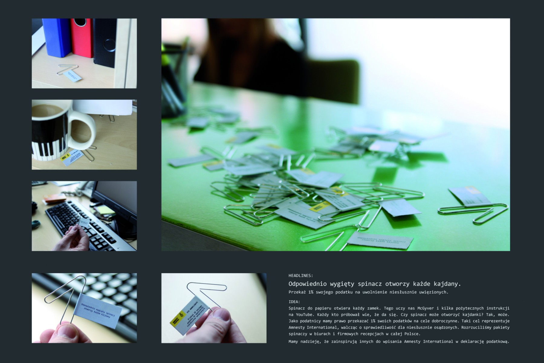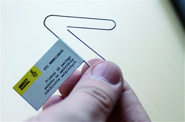 Well, holiday is over so I’m back with Polish Thursday section again. Today’s campaign was realised by Leo Burnett Warsaw for Amnesty International in Poland. Everybody knows (as MacGyver has taught us) that you can unlock different things (such as door or handcuffs) with a paper-clip. You just need to bend it properly. So AI bended it as number one – since you can donate 1% of your tax for charity purposes. And you can also donate this 1% for AI – thus help them to free people from the prisons all over the world. The sets of these paper-clips with a small note attached were placed in the business offices in Poland.