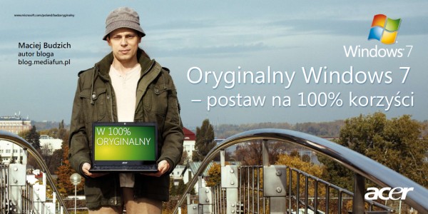 Od pewnego czasu na blipie i FB wspominaliśmy z Maćkiem Budzichem o akcji #blogerzywkampanii. Dziś odkrywam karty :). Otóż wystąpiliśmy we dwójkę (choć osobno :)) w najnowszej kampanii Windows7. To pierwsza w Polsce kampania o takim zasięgu wykorzystująca blogerów jako swoje twarze. Maciej i ja, ale także i inni bohaterowie kampanii – Patryk Góralowski (Microsoft) i Joanna Orleańska (aktorka) – pojawimy się w Internecie, na outdoorze, a także w radiu. Oprócz mediów wysokozasięgowych działania reklamowe prowadzone są także w punktach sprzedaży – do współpracy zaangażowanych zostało blisko 600 firm. Oficjalny start kampanii przypada na 2 listopada, ale od dziś możecie zobaczyć nas w serwisach internetowych (m.in. Onet, Allegro, Nokaut) oraz posłuchać w radiu.