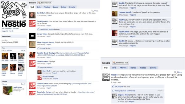 Zachowanie Nestle na własnym profilu FB po akcji z Greenpeace. Nie tylko postanowili cenzurować wypowiedzi, ale do swoich użytkowników zwracali się słowami typu: „Thanks for the lessons in manners. Consider yourself embraced. But it’s our page, we set the rules, it was ever thus.” Żenujący poziom komunikacji w czasach mediów społecznościowych. Dla tych, którym umknęła akcja, polecam podsumowanie na blogu Jacka Gadzinowskiego: Social media lincz – przypadek Nestle.