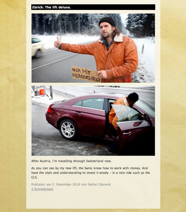W połowie grudnia zakończył się bardzo fajny projekt zrealizowany wspólnie przez agencję Jung von Matt i Stefana Gburecka – fotografa i performera. Akcja pod hasłem „Tramp a Benz” miała pokazać, że człowiek może być jednocześnie wolny i bezpieczny na drodze. 30 listopada Stefan Gbureck wyruszył więc z Berlina w podróż po Europie. Stopem. Miał dotrzeć na południe kontynentu jak najszybciej i jak najbezpieczniej. Warunek był jeden – zatrzymywał wyłącznie… Mercedesy. Do Barcelony dotarł po niecałych 3 tygodniach – gdzie 17 grudnia zakończył się projekt. Podróż Stefana Gburecka można było śledzić na jego blogu (www.tramp-a-benz.com) oraz na profilu na FB (www.facebook.com/trampabenz); na Google Maps zaznaczane były miejsca, które Stefan odwiedził po drodze. Potencjał mediów społecznościowych nie został jednak przy tej akcji do końca wykorzystany – przykładem może być chociażby otwarcie kanału na YouTube i niewrzucenie tam ani jednego filmu. Szkoda, bo naprawdę super pomysł.