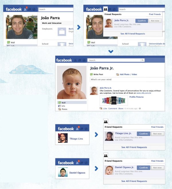 Stworzyli oni na FB setki dziecięcych profili, a następnie wysłali zaproszenia do wybranych mężczyzn. Co istotne, dane dziecko nazywało się dokładnie tak samo, jak osoba, do której wysłano zaproszenie. Dodano jedynie skrót Jr, co miało sugerować, że dane dziecko jest dzieckiem zapraszanego mężczyzny (zadbano również o to, żeby podobieństwo widoczne było także na zdjęciu – vide case poniżej). Nie wiem, ilu mężczyzn, w nerwach (uzasadnionych? :)), nie doczytało tekstu umieszczonego w boksie zaproszenia: „Unikaj takich niespodzianek jak ta. Używaj prezerwatyw Olla Condoms.”
