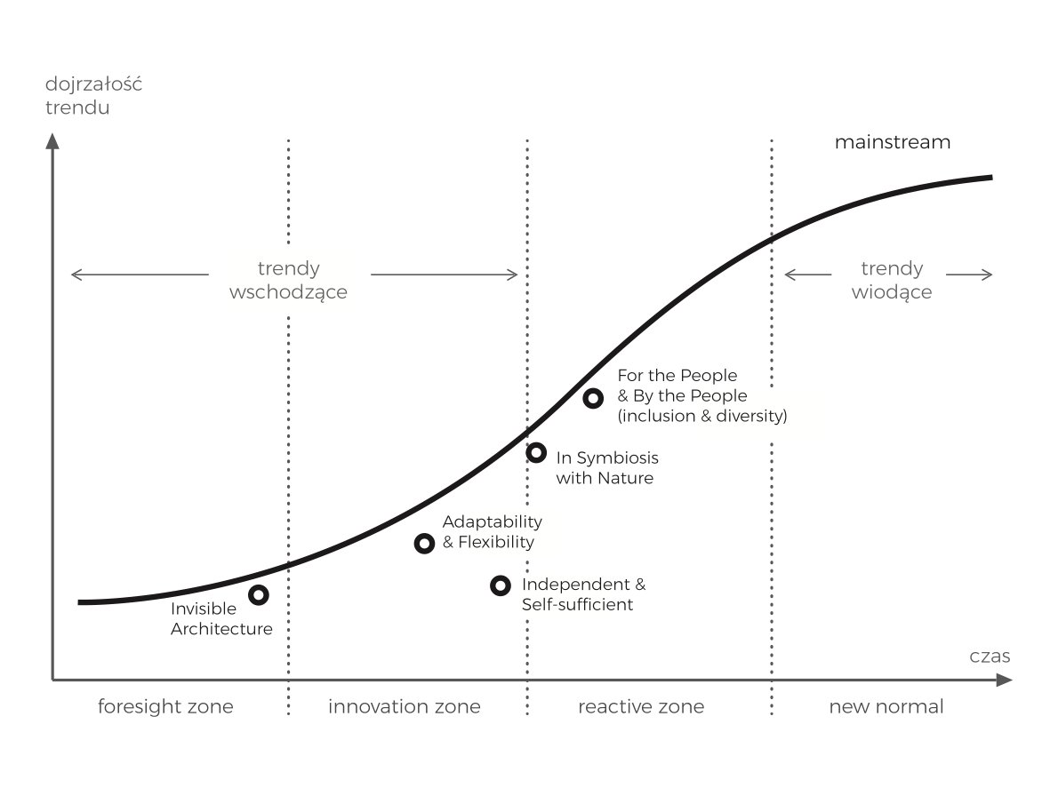 Jednocześnie muszę podkreślić, że każdy ze scenariuszy potrzebuje inną ilość czasu, żeby mógł być zrealizowany. Najbardziej oddalony w czasie jest scenariusz Niewidzialna Architektura – ze względu na nie w pełni rozwinięte jeszcze możliwości technologiczne, najbliżej nas Dla ludzi i przez ludzi – wpisujący się w niezwykle silny aktualnie trend inkluzywności i różnorodności (por. wykres poniżej).