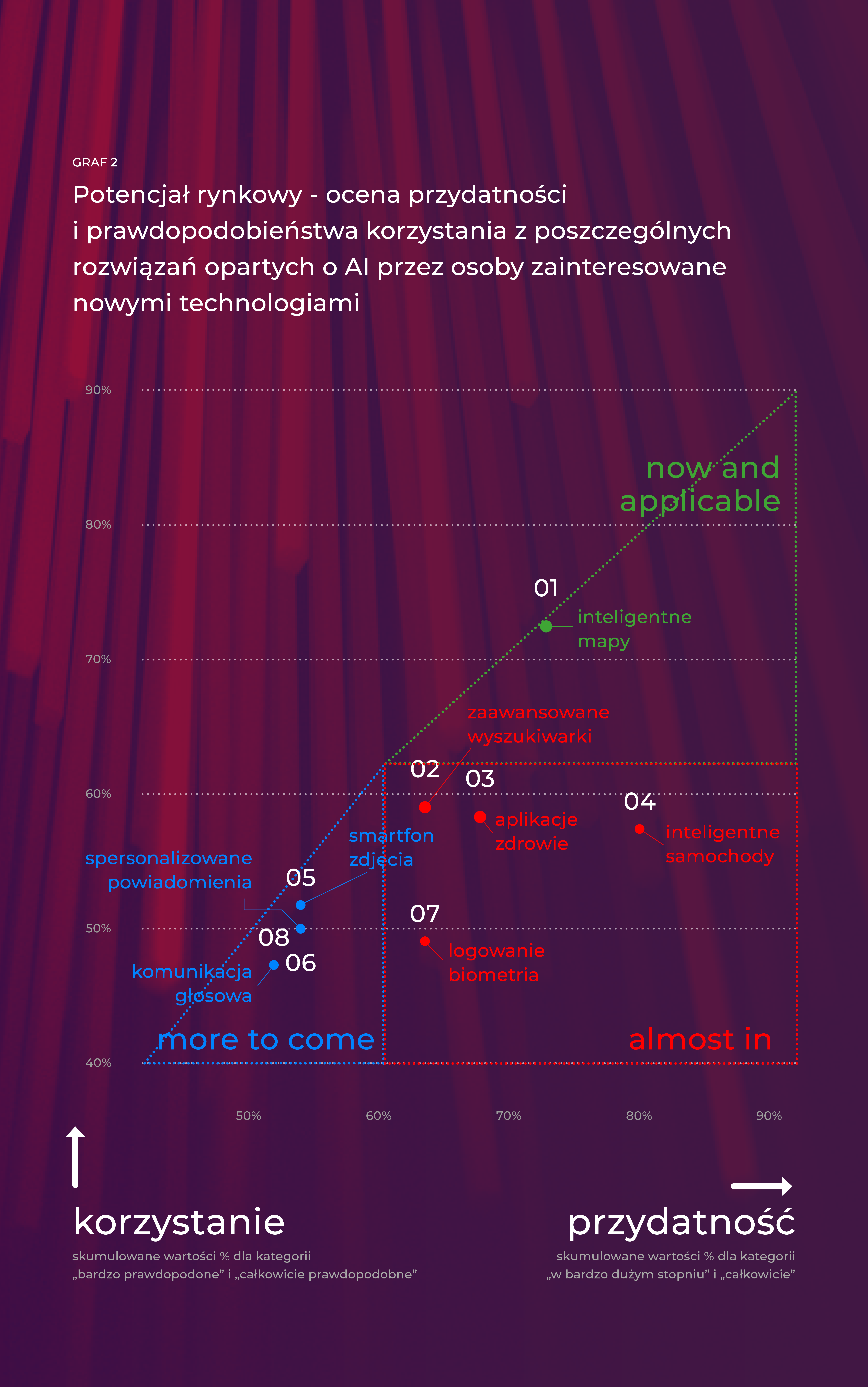 Dodam, że w raporcie oprócz stosunku biznesu do AI, znajdziecie także stosunek i postawy internautów wobec tej technologii. Z ciekawych wniosków w tym kontekście polecam Wam przede wszystkim matrycę przydatności i prawdopodobieństwa, którą opracowaliśmy i która pokazuje gotowość rynku do przyjęcia danej technologii (vide graf poniżej).