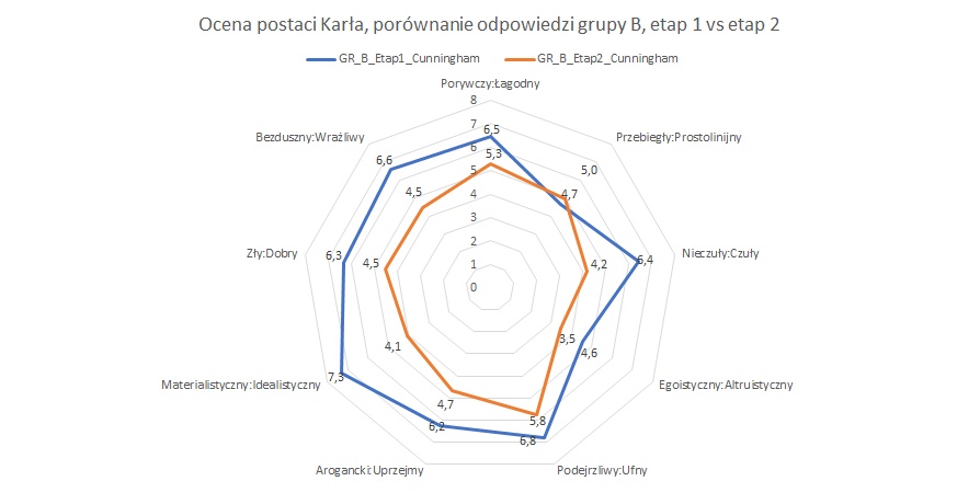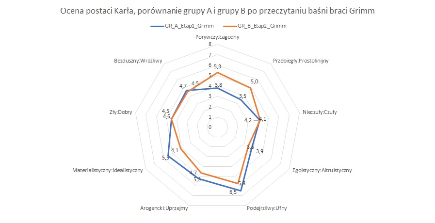 Co ciekawe, kiedy porówna się oceny postaci Karła dokonane przez obie grupy po przeczytaniu baśni braci Grimm, widać, że grupa B, która przeczytała tę baśń jako drugą – czyli miała więcej informacji i szerszy kontekst pochodzący z opowiadania Cunninghama – ocenia Karła lepiej, zwłaszcza na wymiarach porywczy:łagodny, przebiegły:prostolinijny, nieczuły:czuły (vide wykres poniżej).