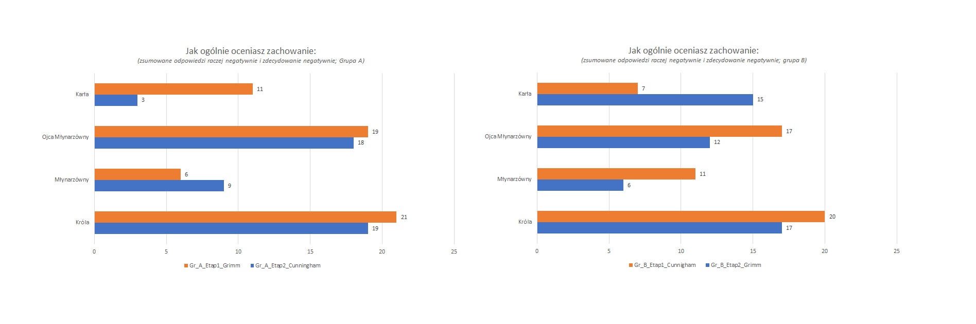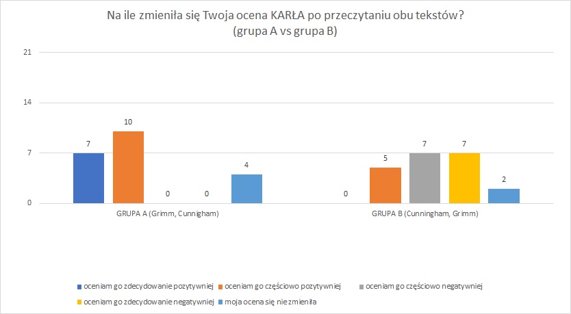 Oprócz tego, że uczestnicy eksperymentu oceniali Karła pod względem cech charakteru, zostali poproszeni również wprost o odpowiedź na kilka pytań, w tym takich jak: Jak ogólnie oceniasz zachowanie poszczególnych bohaterów? Gdybyś miał/-a stanąć po czyjejś stronie, po czyjej byś stanął/ stanęła? oraz Na ile zmieniła się Twoja ocena Karła i Młynarzówny po przeczytaniu obu tekstów? Na dwóch poniższych wykresach widać wyraźnie – choć w grupie A jest to mocniejsze – że zmienia się przede wszystkim negatywna ocena Karła i Młynarzówny w zależności od tego, który tekst został przeczytany. Po przeczytaniu baśni braci Grimm aż 11 osób w grupie A oceniło Karła negatywnie, po przeczytaniu drugiego tekstu liczba ta spada do zaledwie 3. W grupie B – odwrotnie – po przeczytaniu tekstu Cunninghama, który dawał zachowaniu Karła szerszy kontekst, 7 osób oceniło tę postać negatywnie. Ale po przeczytaniu drugiego tekstu liczba osób, które oceniły Karła negatywnie, wzrosła dwukrotnie.